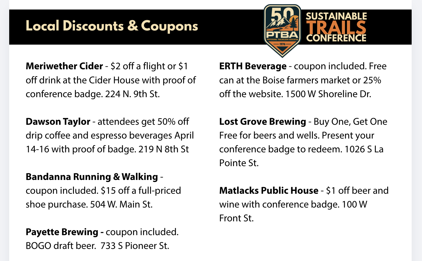 We’re share participating businesses and discount details, so you can easily find great local spots to visit while you’re in town. We’re grateful for the strong local support helping make the conference experience even better.